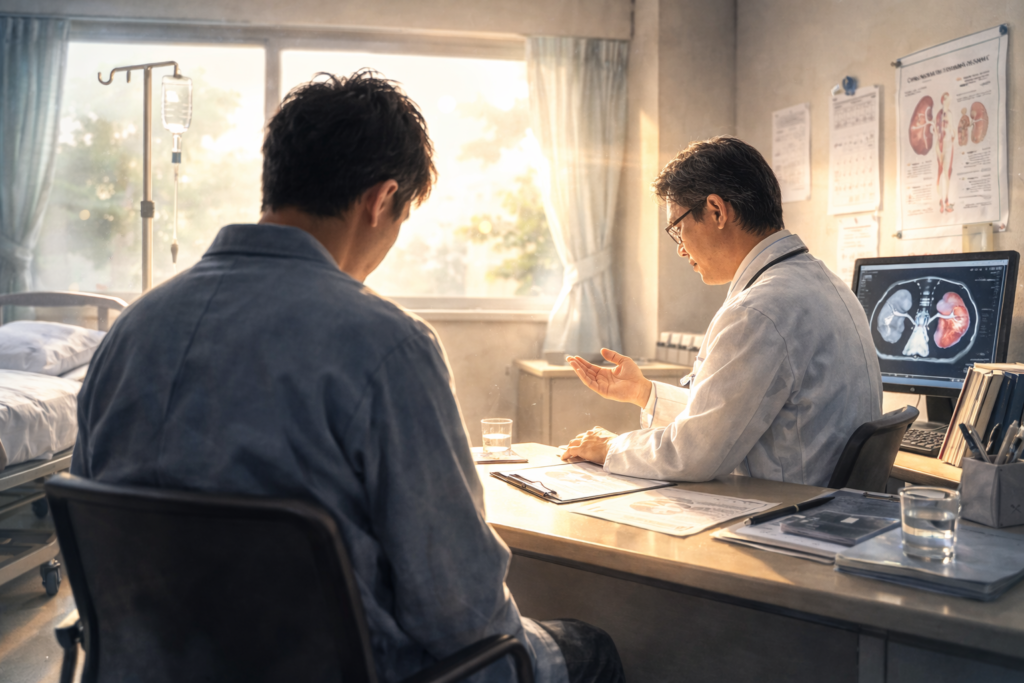 検査は午前中いっぱい。ところがその日のうちに、超音波で腎臓に4cm程度の瘤(こぶ)があると言われ、造影剤を使うCTで再検査を勧められた。2週間後の予約を取って帰宅。――よくある「念のため」だろう。そう思い込み、気にしないよう努めた。実際、この時点では深刻に考えていなかった。
